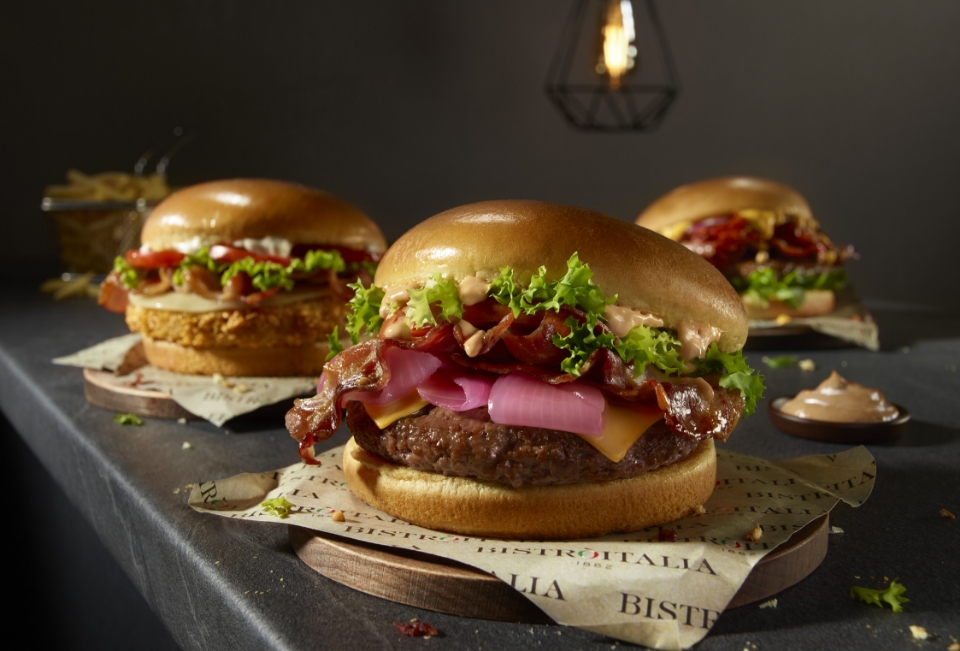 Bun, 180 g “Giotto” burger, omelette, double crispy bacon, sweet provola cheese, Bistrò Italia sauce 1882