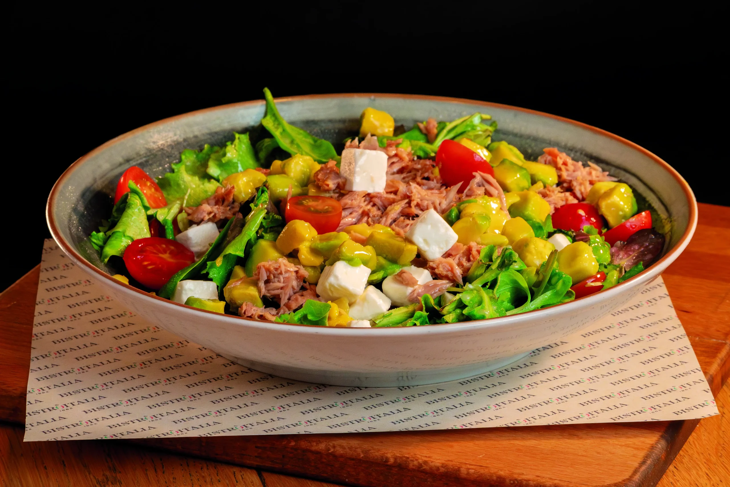 Salad, mixed salad, tomato, tuna in olive oil, mozzarella di bufala cheese PGI, corn