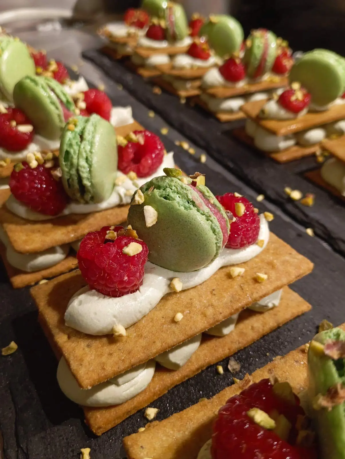 with fresh spinach leaves, raspberry balsamic vinegar cream, parmesan shavings