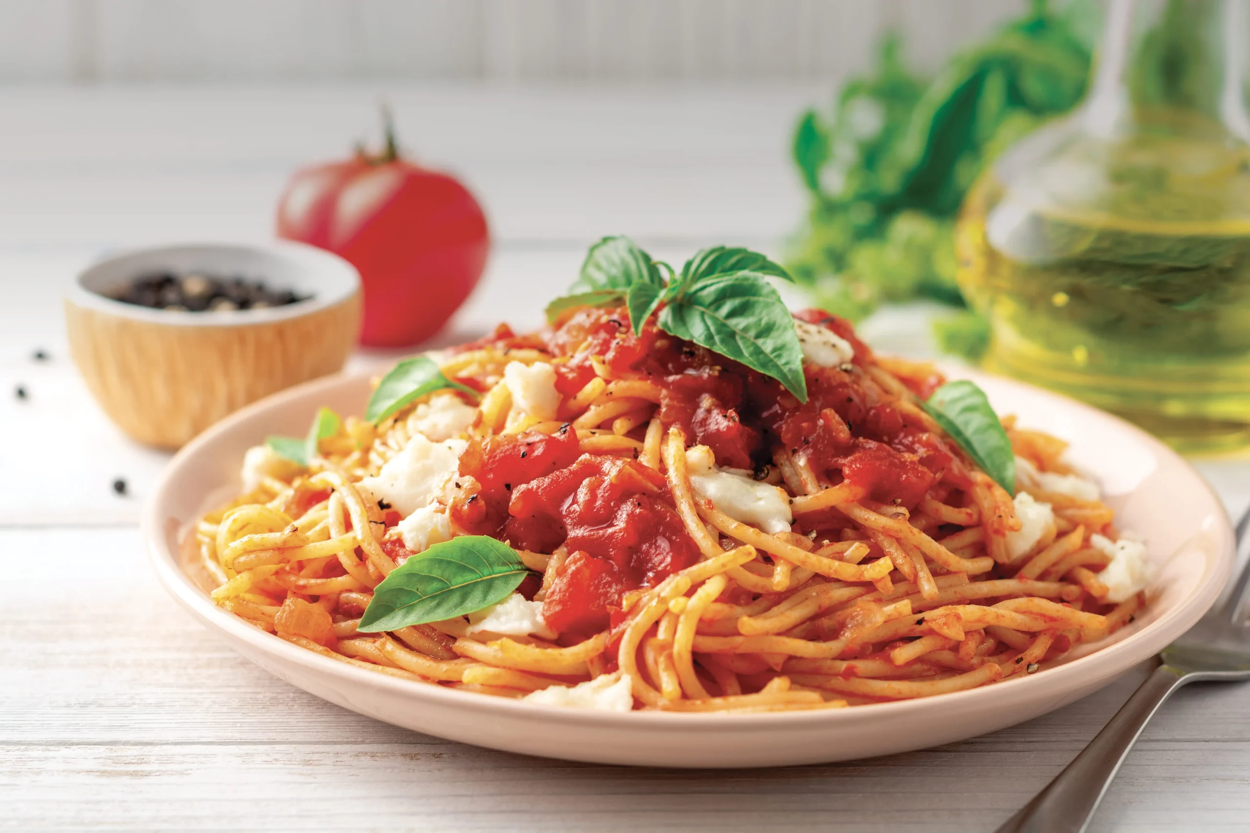 with Campania tomatoes PGI, stracciata di bufala PGI, fresh basil