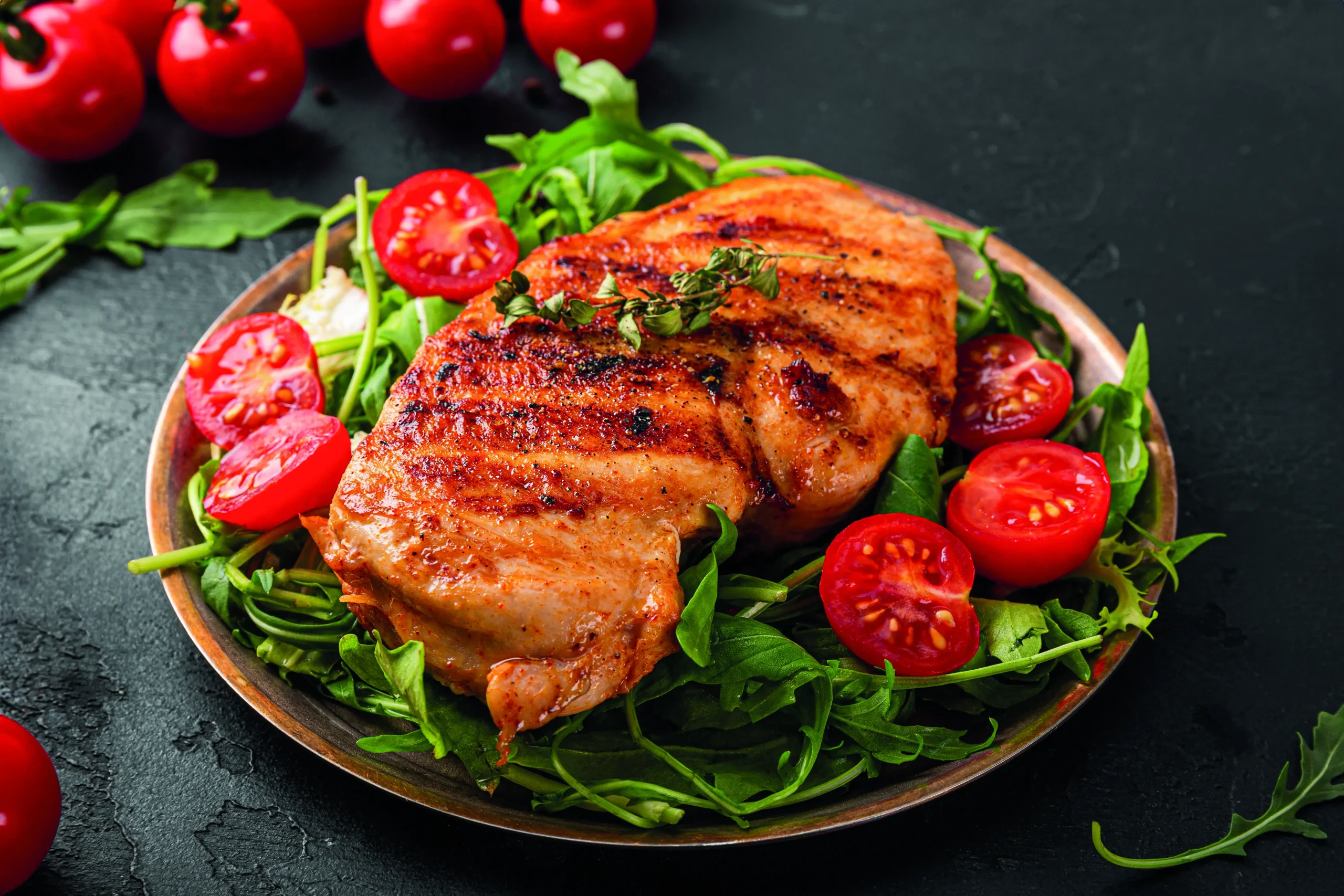 Mixed salad with Thai sweet and sour sauce, grilled and marinated chicken with coriander spices