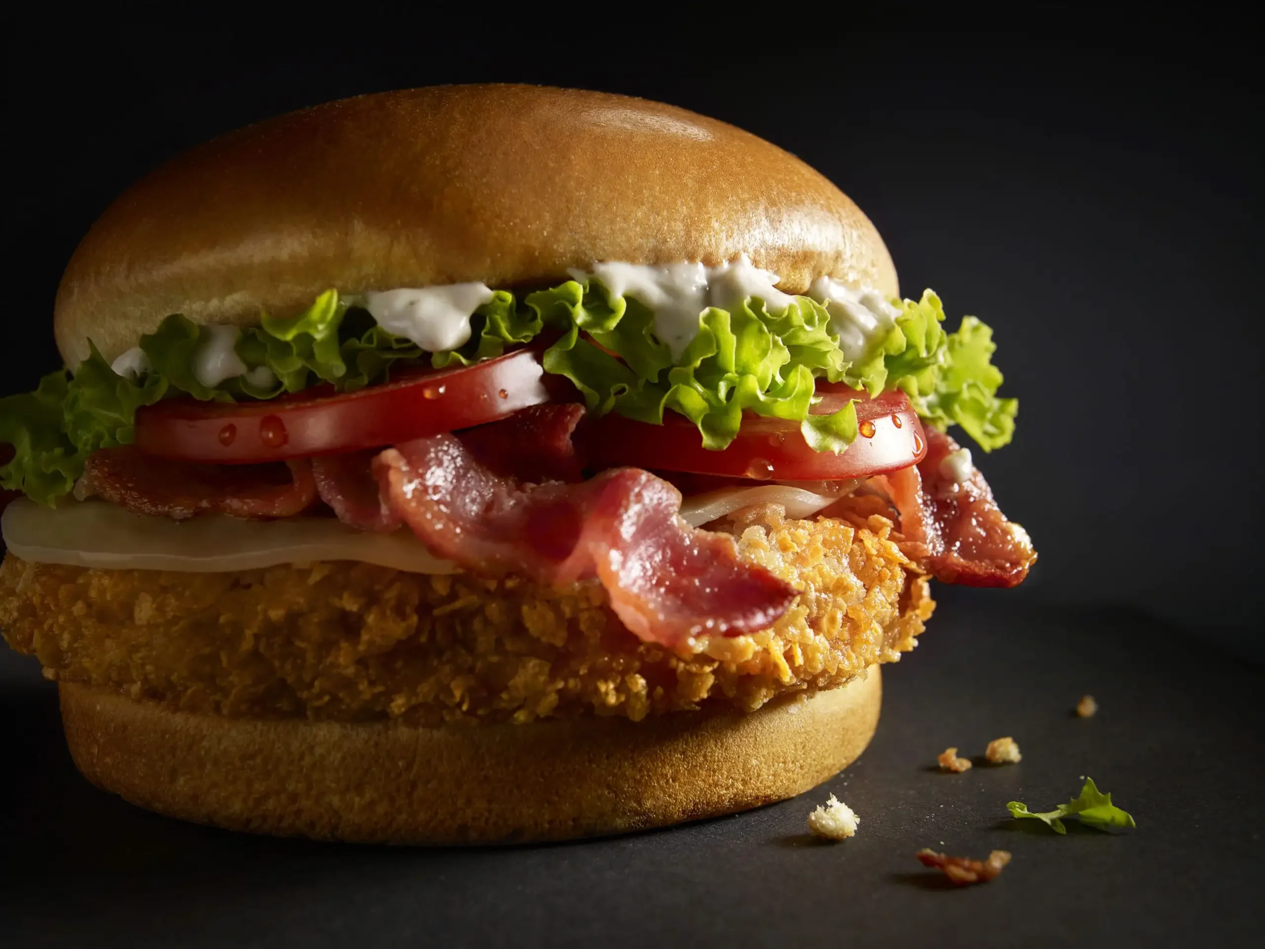Bun, crispy chicken cutlet, sweet Provola cheese, crispy bacon, tomato, lettuce, Caesar salad dressing